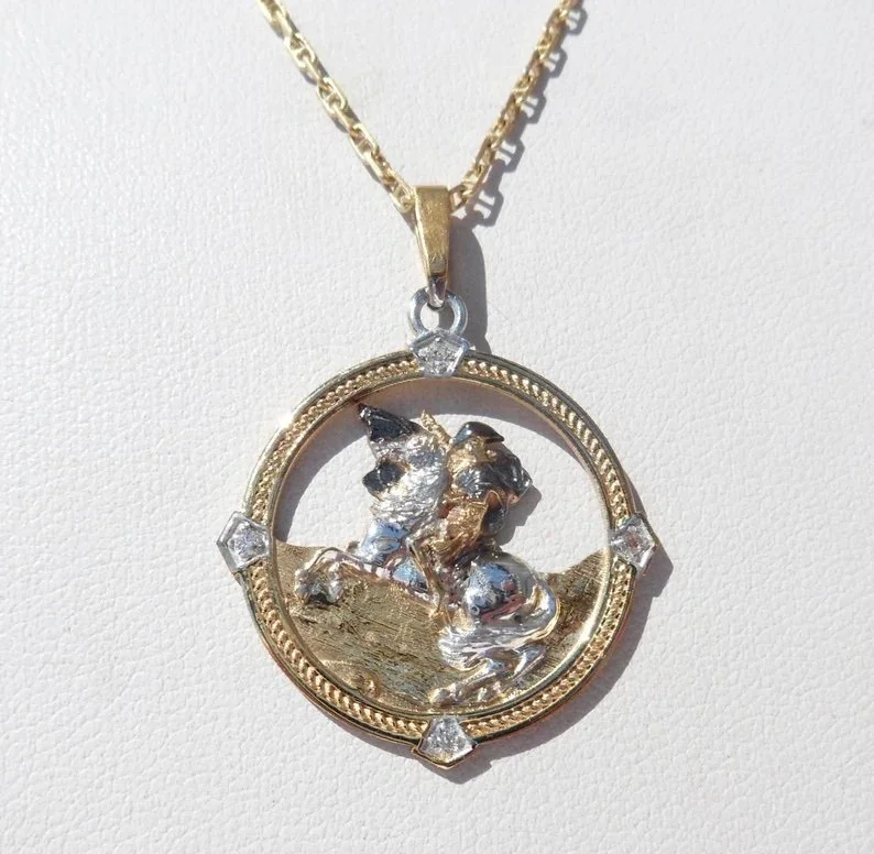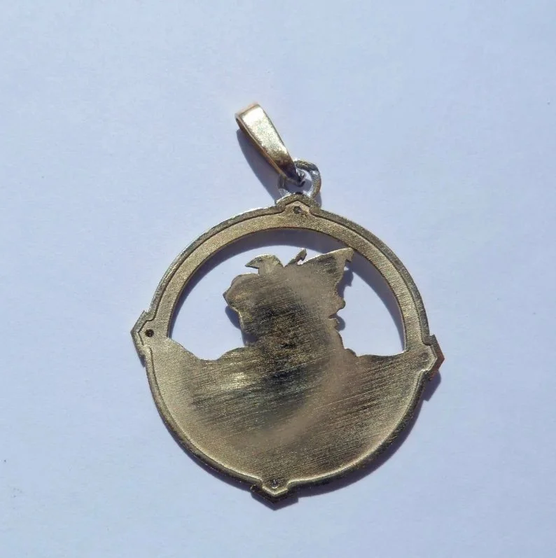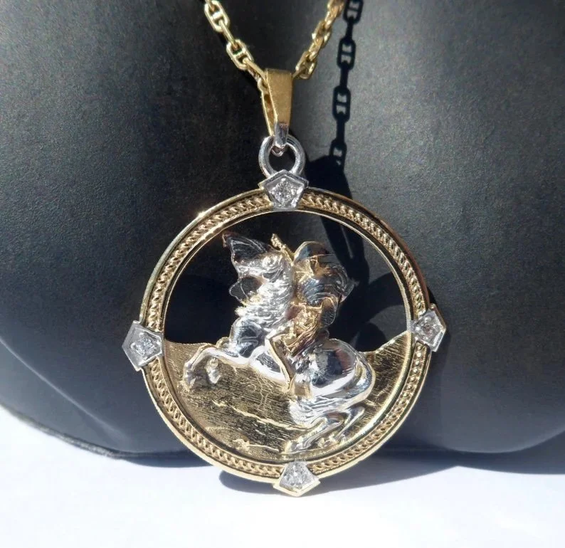 Ce pendentif français, intitulé "Napoléon passant le Col du Grand Saint Bernard"est un charmant bijou. Il est orné de quatre diamants de taille moderne, d'un poids total de 0,12 carat, et est monté sur de l'or jaune massif 18 carats. Le pendentif pèse 4,30 grammes et son diamètre central mesure 25 millimètres (1 pouce). Il est poinçonné d'une tête d'aigle, le poinçon français 750 (or 18 carats), et présente une légère patine naturelle qui change avec la lumière du jour.